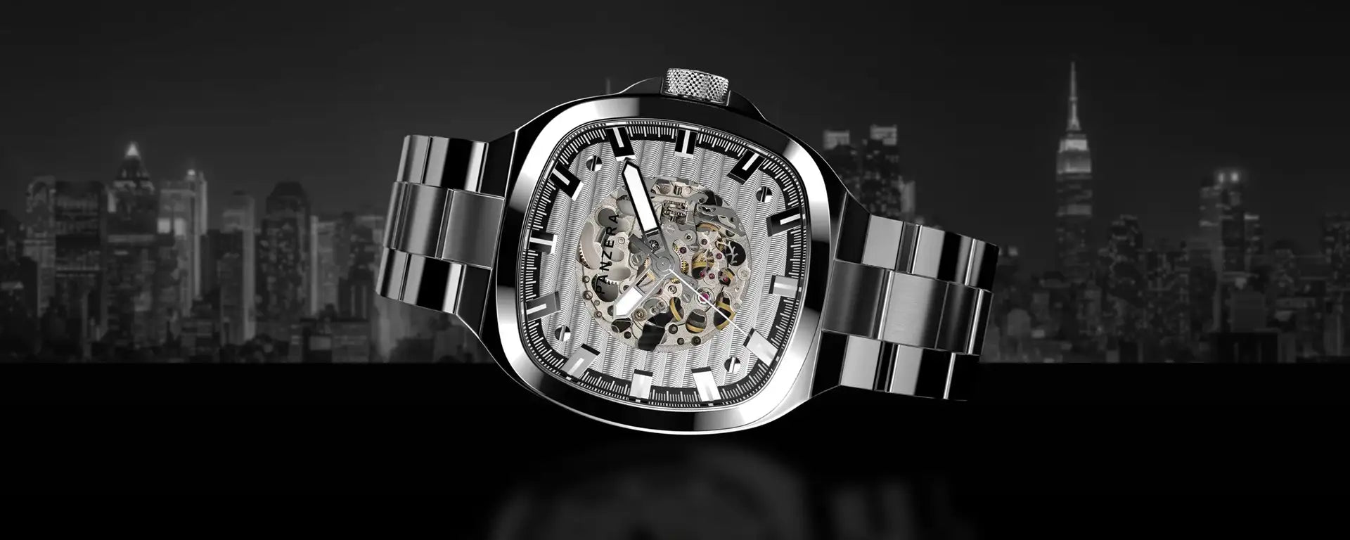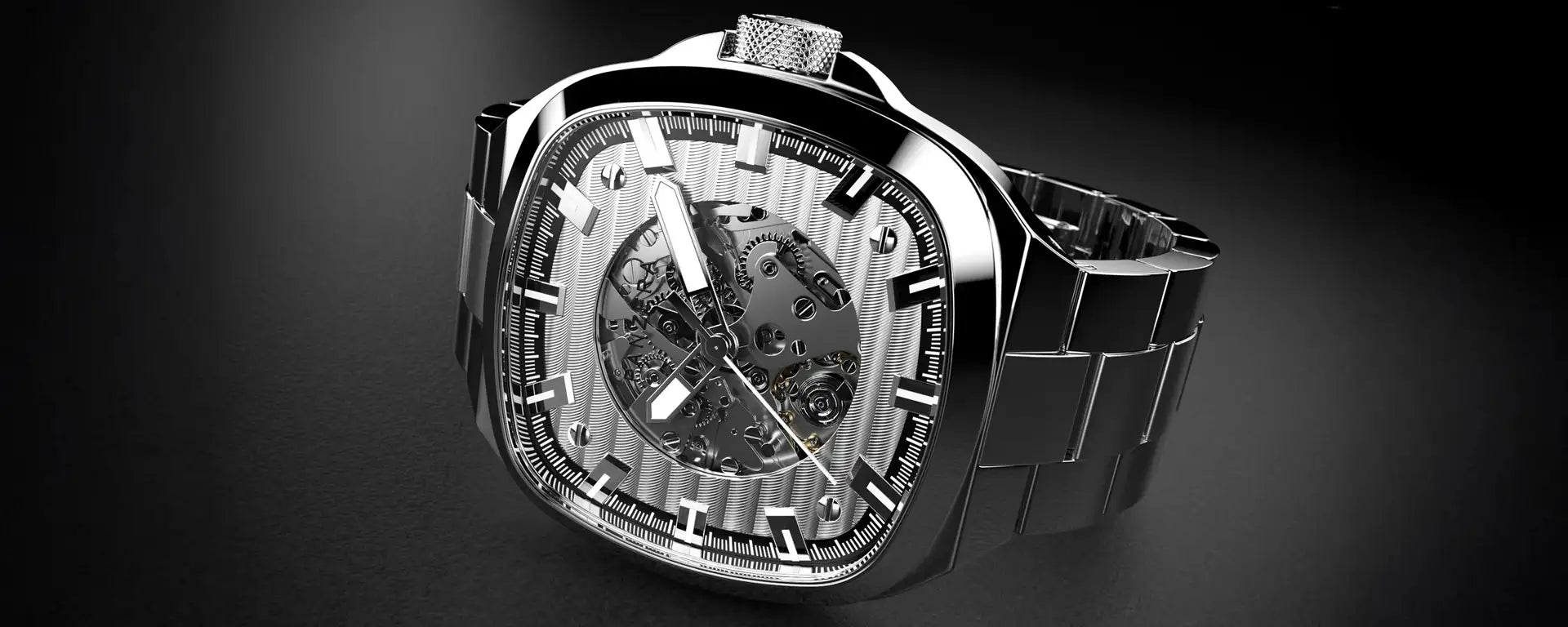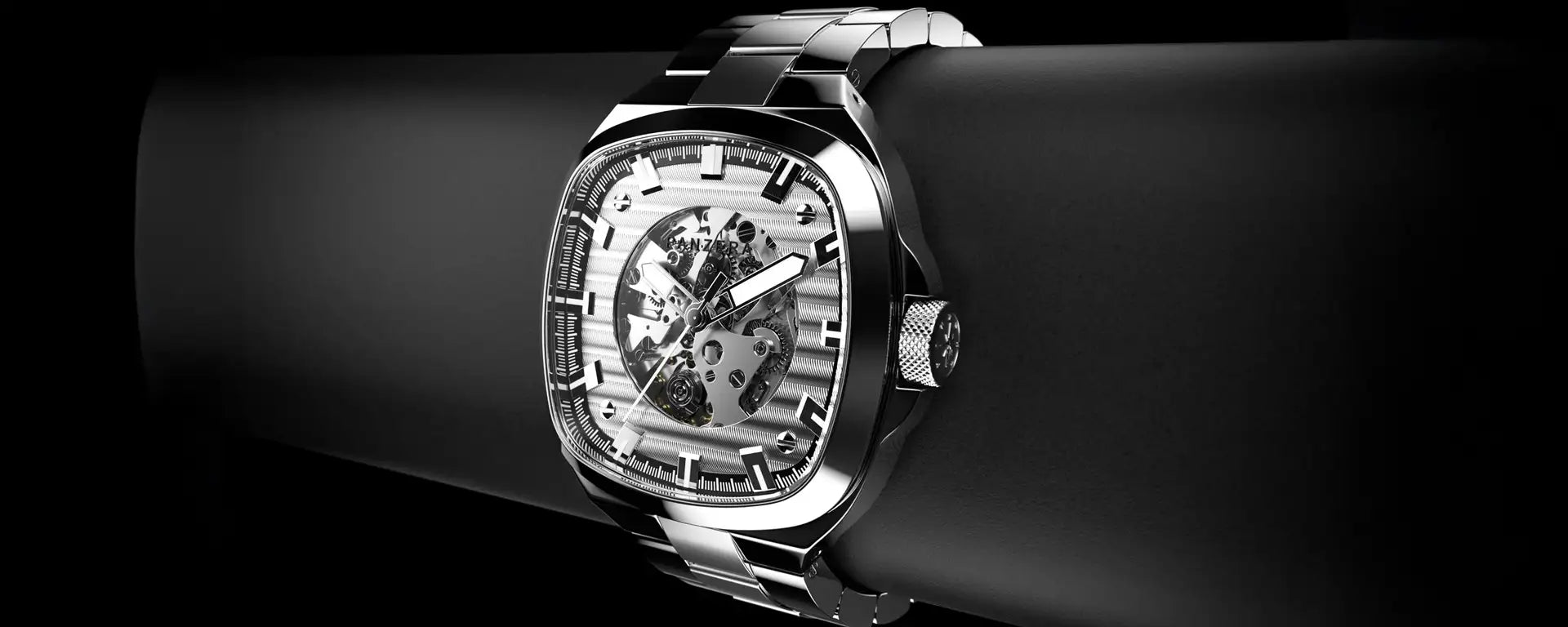 El CLASSIVO 43-01 es un llamativo reloj automático diseñado para aquellos que aprecian el diseño clásico con un toque contemporáneo. Con una sólida caja cuadrada de acero inoxidable 316L, cuenta con una esfera esquelética que deja al descubierto el movimiento mecánico que hay debajo.