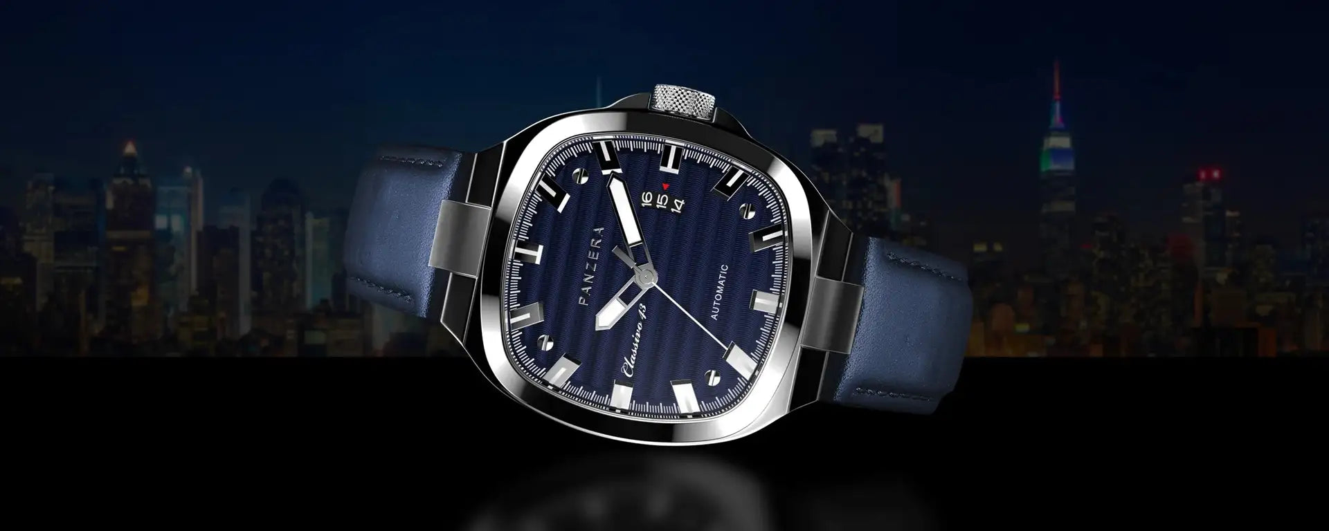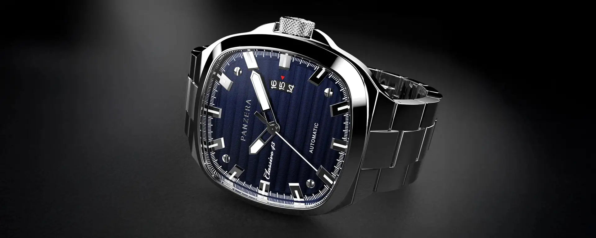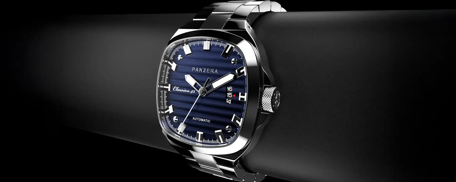 Seleccione entre la gama completa de modelos Classivo 43 para encontrar su reloj personalizado perfecto. Disponible en esferas negras, azules, plateadas y esqueléticas.
