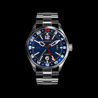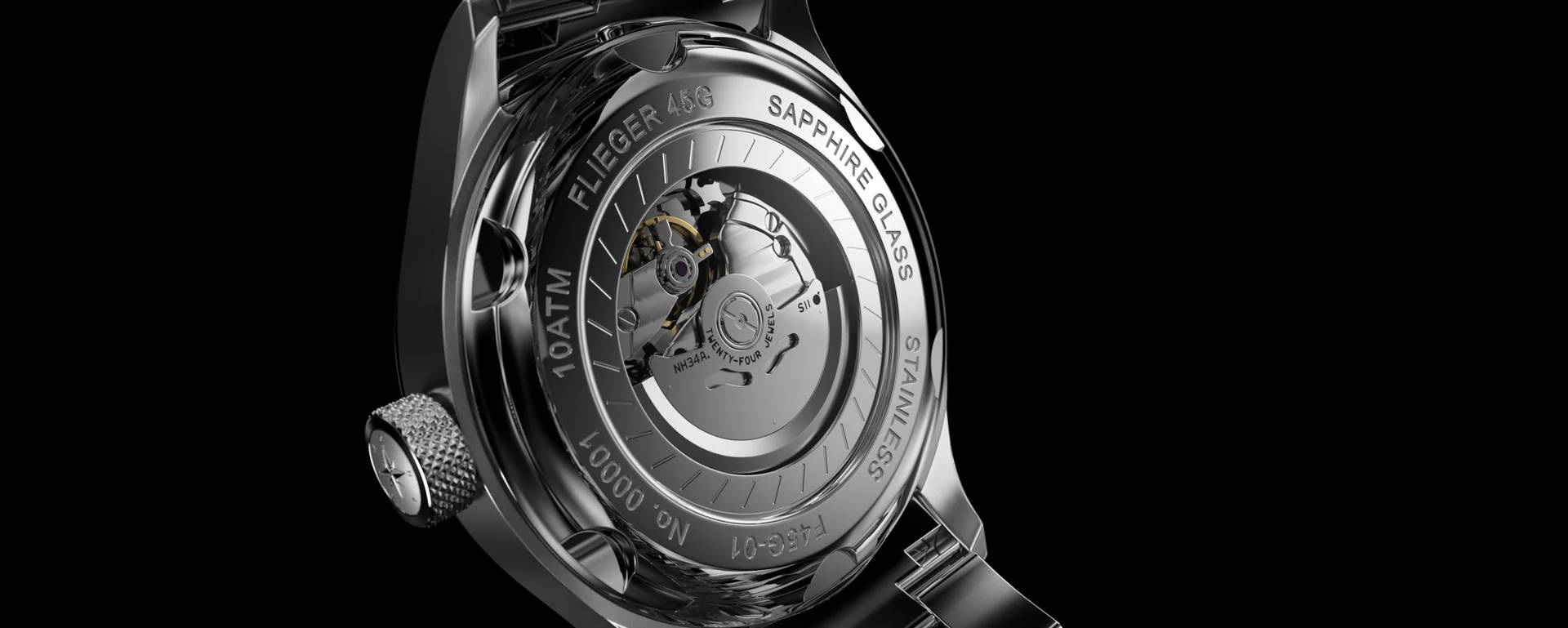 El reloj de piloto automático Flieger 45G tiene una esfera negra mate, azul medianoche o blanco puro con caja de acero inoxidable 316L con acabado en plata cepillada y pulida o negro mate IP.