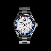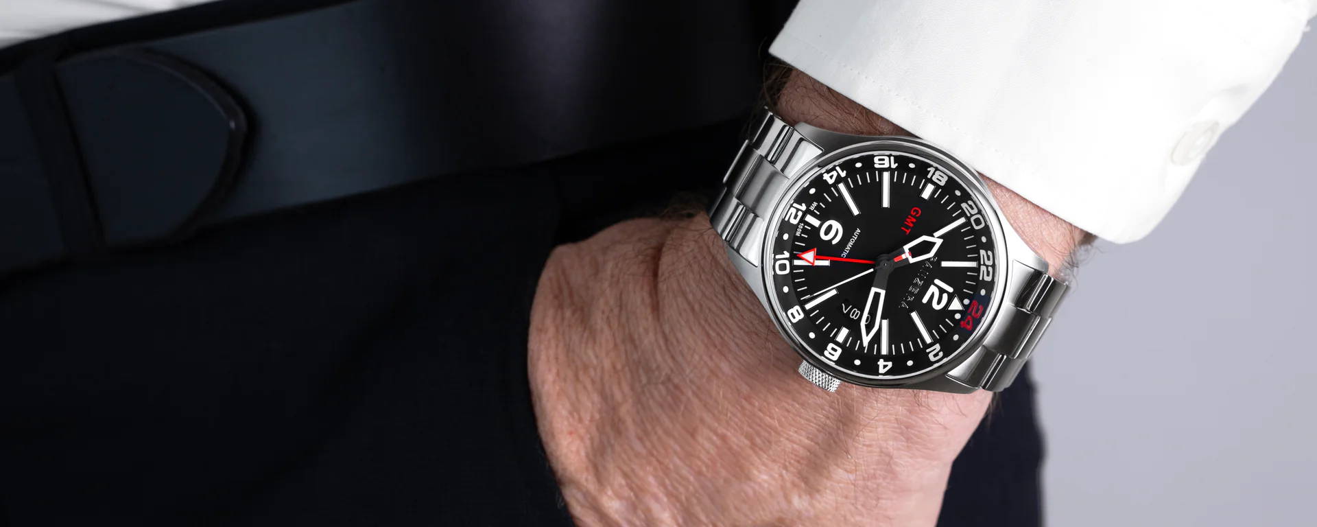 El Panzera Flieger 45G, construido en Australia, es un reloj impresionante que combina el estilo clásico y la herencia de la aviación antigua con características contemporáneas que incluyen una segunda zona horaria GMT de 24 horas. Está impulsado por un confiable movimiento automático japonés NH34A que se puede admirar a través del fondo de cristal de zafiro. Tiene una esfera grande y clara con manecillas y marcadores luminosos que facilitan la lectura en cualquier condición de iluminación. También cuenta con un cristal de zafiro abombado que lo protege de rayones y reflejos. El reloj viene con una variedad de correas diferentes que se pueden cambiar fácilmente en segundos con su mecanismo de liberación rápida.